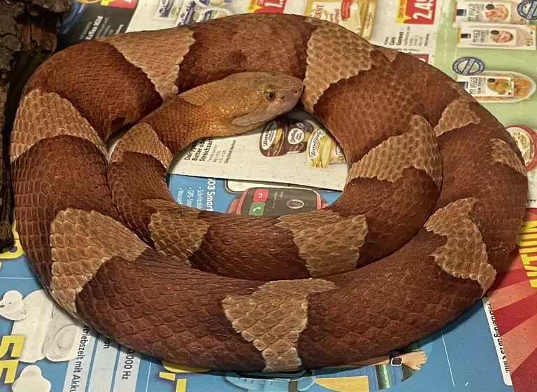 Der Kupferkopf ist eine in Nordamerika vorkommende Giftschlange, die selten Längen über 100 cm erreicht. Das Gift dieser Art ist ein Hämotoxin (also ein Gift, dass die roten Blutkörperchen und damit den Stofftransport schädigt), ein Biss ist sehr schmerzhaft, aber in der Regel für einen Erwachsenen nicht tödlich. Übrigens… Giftschlangen geben bei einem Abwehrbiss meist nur wenig bis gar kein Gift ab, da dieses zum Töten der Beute nötig ist – aber Vorsicht, darauf verlassen sollte man sich natürlich nicht!